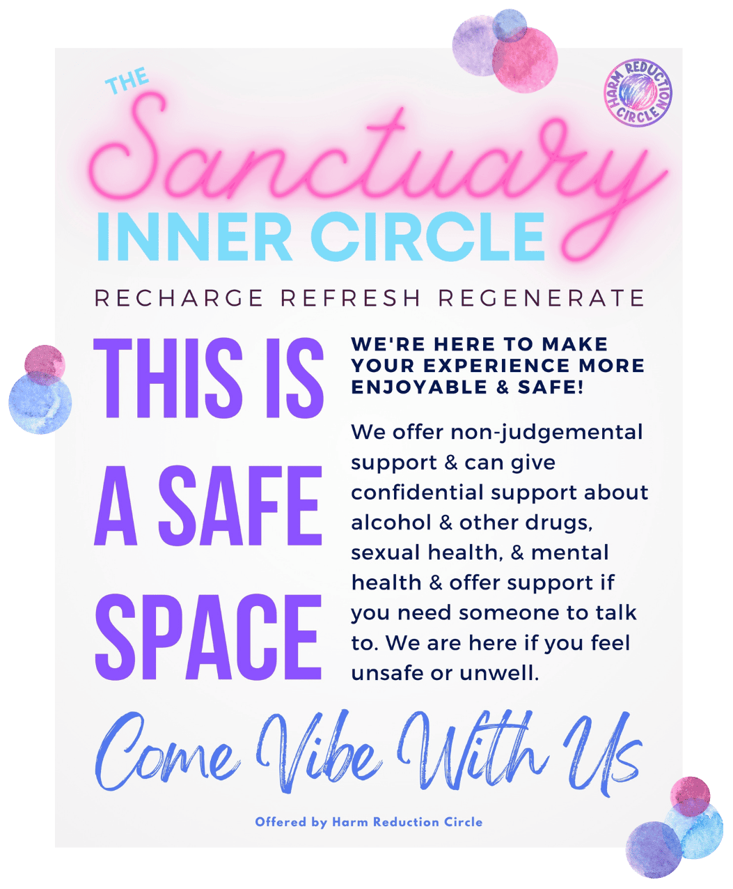 The Inner Circle Sanctuary is the heart of our nightlife services—a calm, judgment-free refuge where guests can step away from the intensity of the event. Staffed by trained peers, the space offers grounding, hydration, and supportive conversation for anyone who feels overwhelmed, unwell, or simply in need of a break.